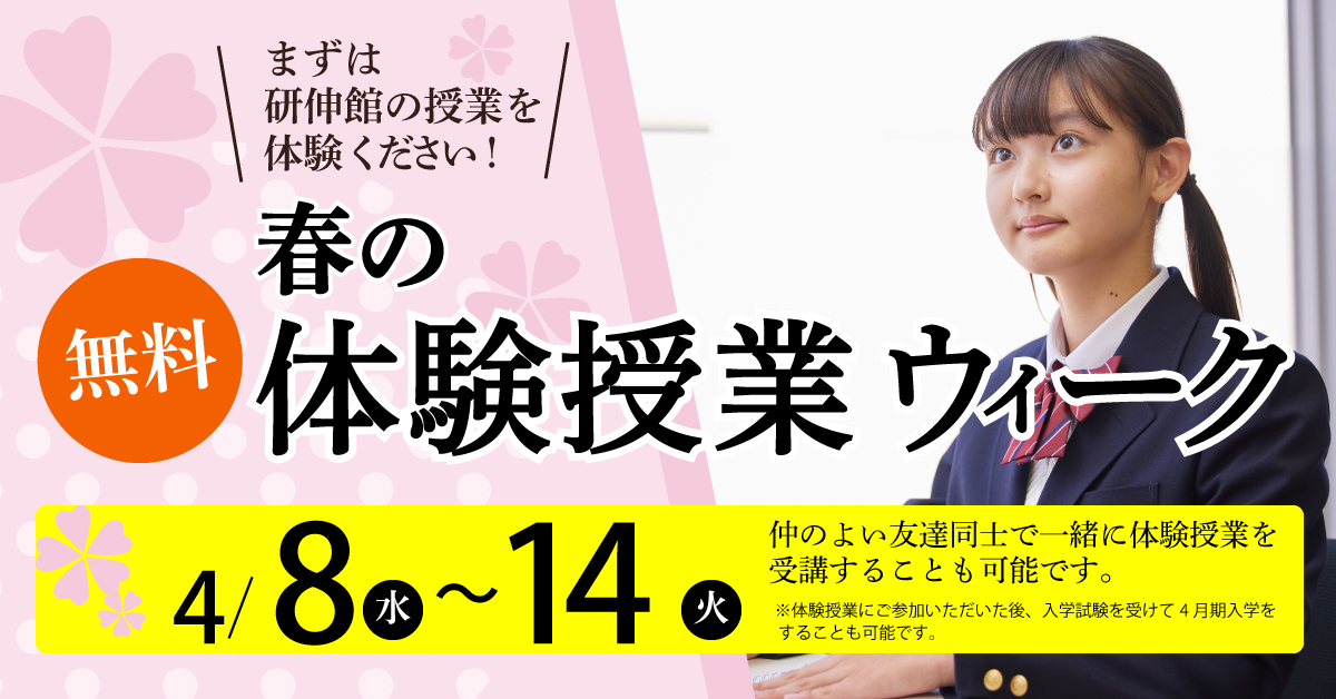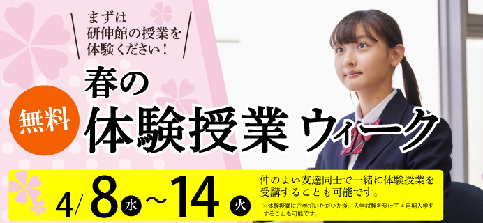 4/8(水)~4/14(火) は「体験授業ウィーク」です。研伸館中学生課程の実際の授業を体験していただくことができます。