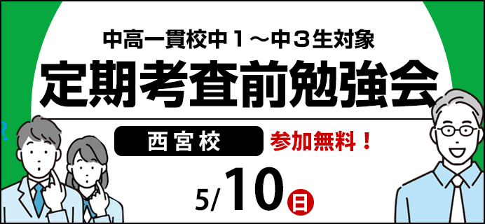 研伸館中学生課程西宮校では、学校の定期考査に向け、5月10日(日)に勉強会を行います。講師が常駐し、質問対応も行いますのでぜひ勉強に来てください。