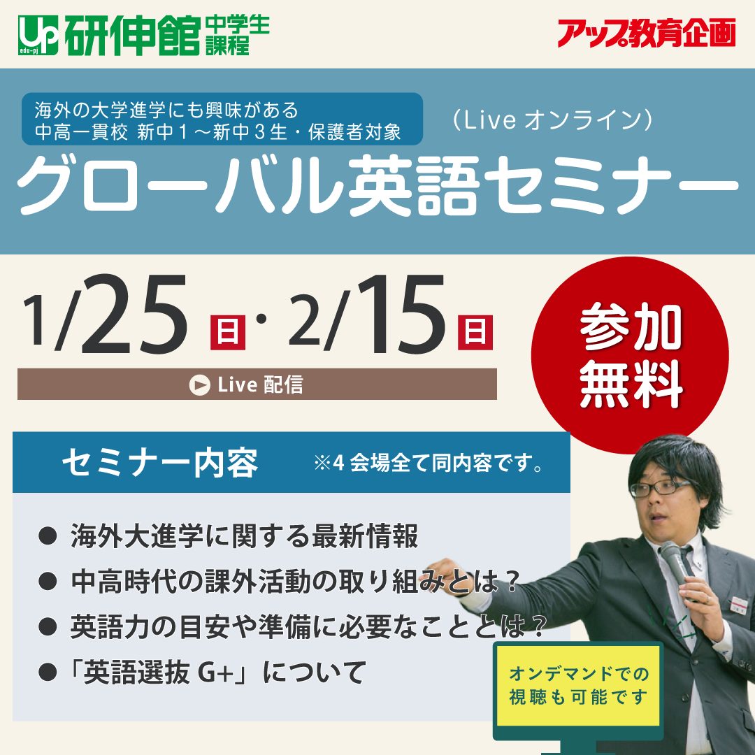 今回のセミナーでは、海外大進学の実態に迫ります。また、研伸館中学生課程で開講している「英語選抜G+」についてもお話ししますので、世界に通用する英語学習に興味がある方は誰でもご参加ください。
