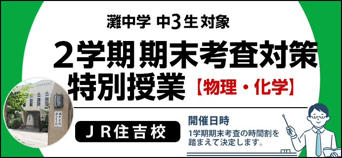 JR住吉校では、灘中学3年生を対象に、定期考査に向けての学習の機会として“定期考査対策特別授業【物理化学】”を開講いたします。学校の進度・内容を考慮した演習や解説を行う予定です。ぜひこの機会をご活用いただき、万全の体制で定期考査に臨んでください。