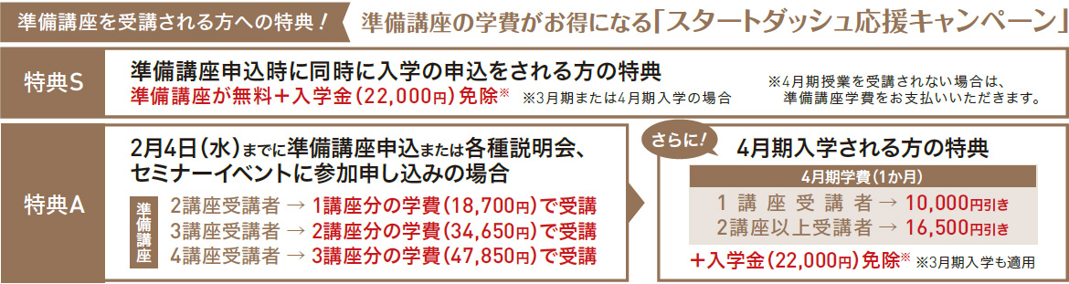 - 準備講座における無試験入学制度の認定は、4月期入学に限り有効となりますのでご注意ください。