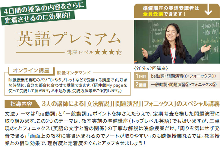 | 受講特典 | ①受講者全員 ●研伸館特製『英語・数学学習のポイントクリアファイル』 ●蛍光ペン3色セット ②英語受講者 ●中1英単語集『春単123』 ③数学受講者 ●作図の練習帳/ルーズリーフ(宿題提出用) ほか、フォローアップDayを設定し、お子さまの学習フォローを実施いたします。 |