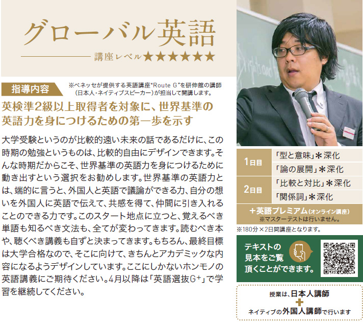 中学で学習を始める「科目としての英語」を体験するためにもぜひ受講してください。英語の既習者でも、「易しくて退屈」というふうにはならないと思います。ただし、英検3級以上を取得している方にはグローバル英語をおすすめします。