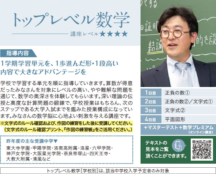 掲載している中学は、どの講座を受講したら良いか悩まれたときにご参考にして頂く、あくまでも目安のようなものですので、その学校以外の方も受講して頂けます。なお、学校別講座は該当中学入学予定者のみ対象となります。