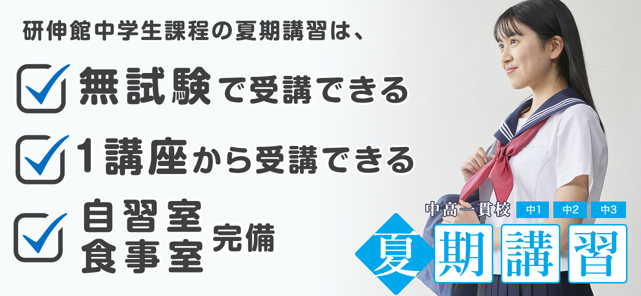 研伸館中学生課程の夏期講習では、基礎力養成・重要単元攻略・新しい単元の先取りなど、目的別の種類豊富な講座で確かな実力をつけ成績アップにつなげます。